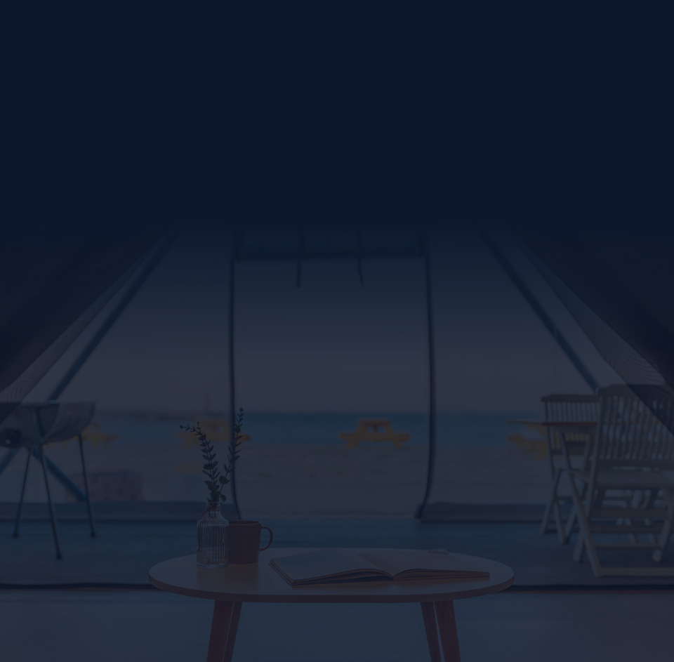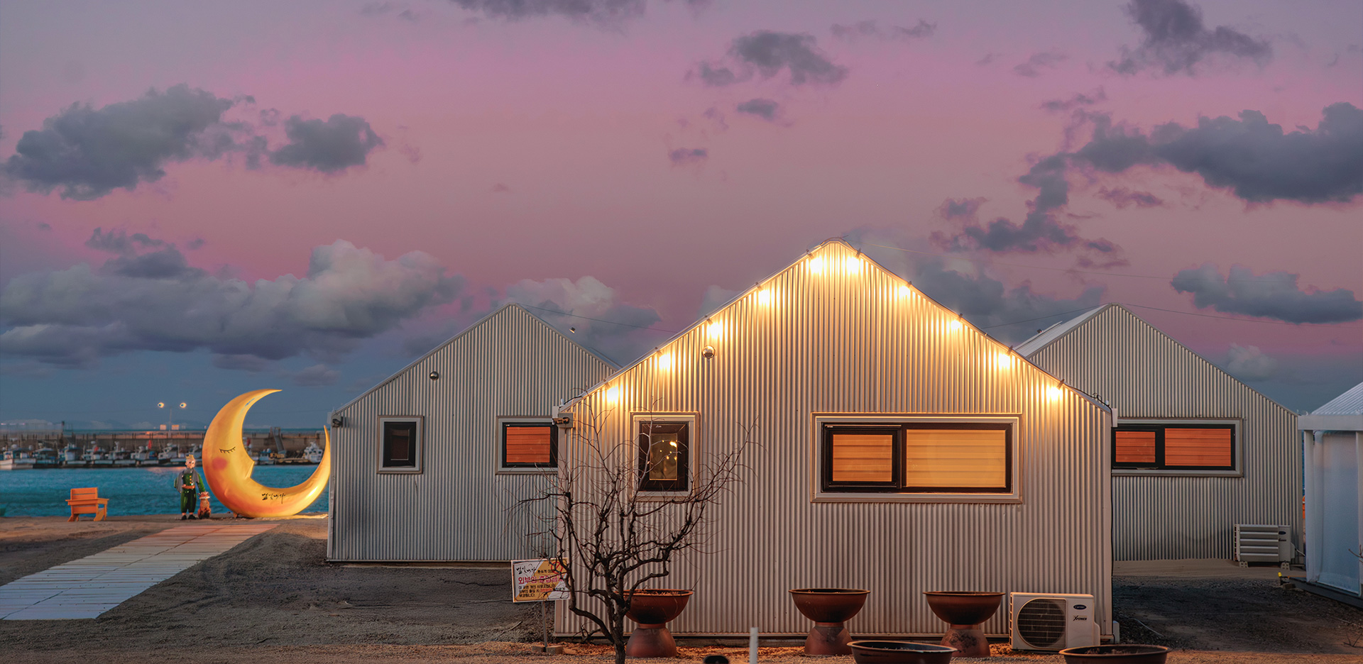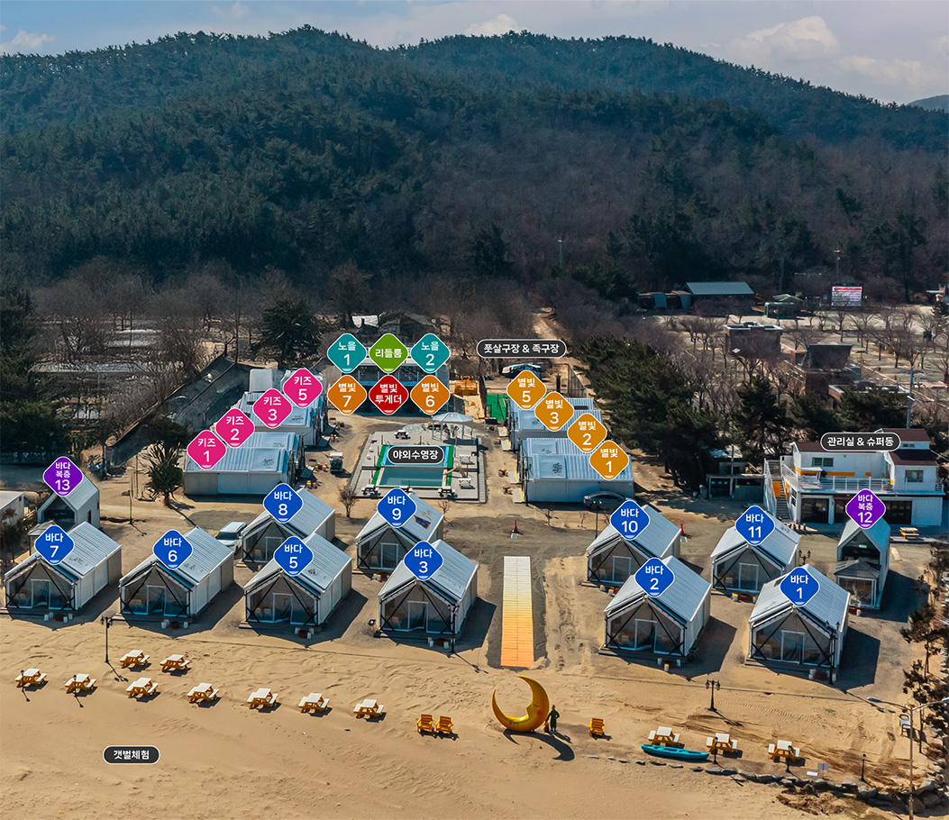 넓은 수평선이 보이는 바닷가위에 글램핑과 펜션의 만남..