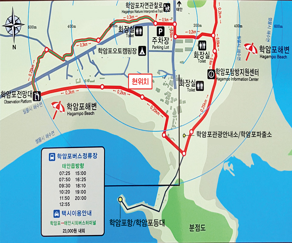산책로에 올라서면 아름다운 학암포 해수욕장이 한눈에 보이는 전망 좋은 곳입니다.